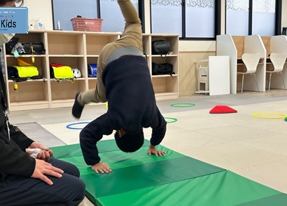 バランスストーン、ラダーリング、マットなどを使い、跳んだり、バランスを取ったり、でんぐり返しをしたりと、とにかく体全体を使いました。