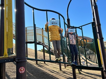 山の頂上まで登り景色を楽しんだり、ロング滑り台や複合遊具で遊んだり。ロング滑り台はやっぱり人気で何度もなんどもすべっていました。